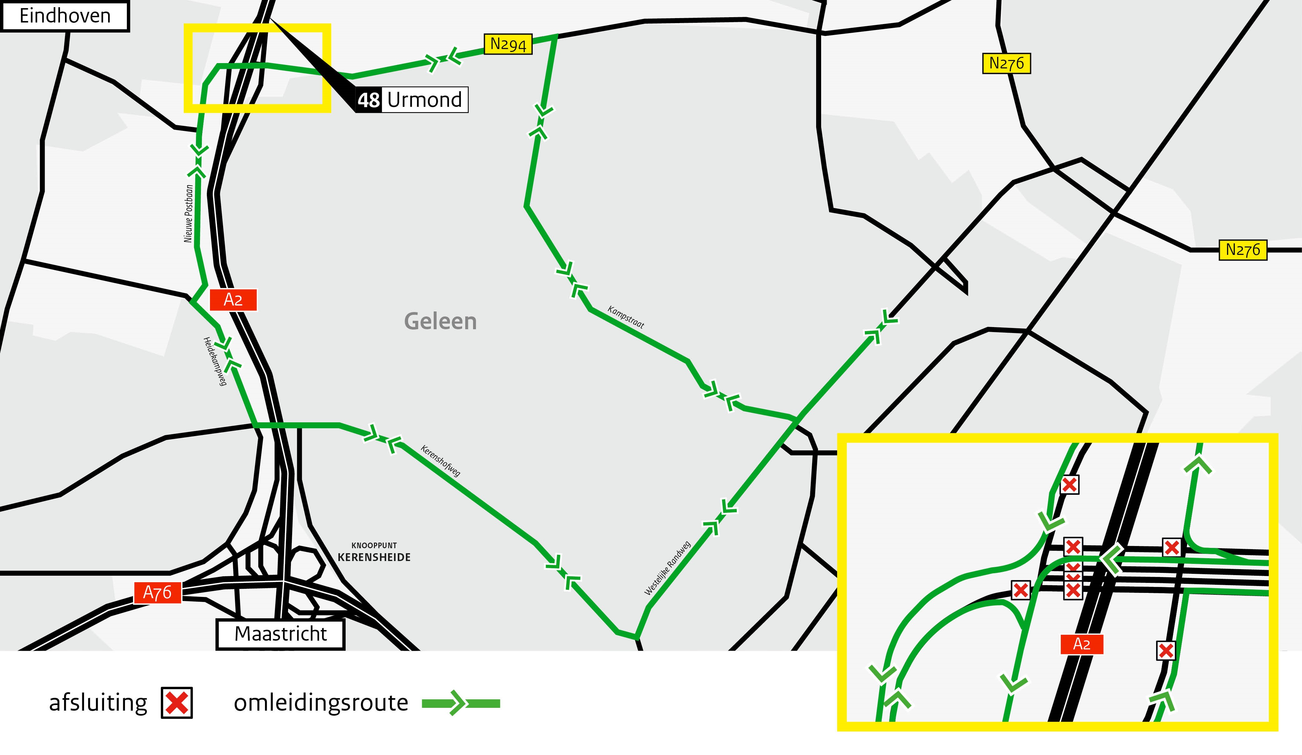 - Verkeer vanaf de A2 vanuit Eindhoven via afrit 48 Urmond kan niet linksaf slaan richting Sittard.