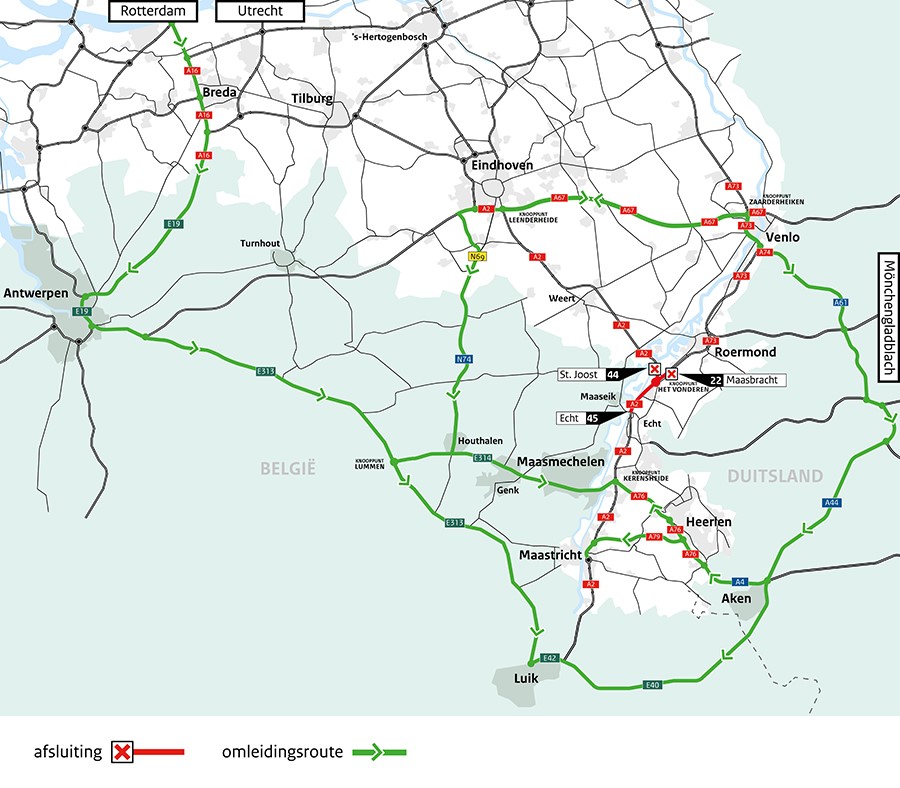 - Verkeer vanuit Eindhoven richting Maastricht wordt omgeleid via de N69/N74 (België/Houthalen-Helchteren).
