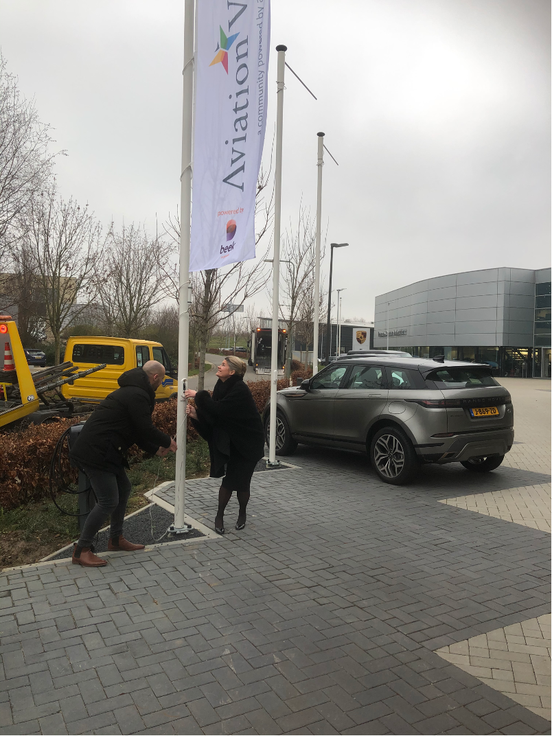 Tijdens het interview vertelt Christine van Basten-Boddin waar de gemeente Beek komend jaar op economisch gebied op inzet. Twee speerpunten daarbij zijn community building en inzetten op een BIZ (Bedrijveninvesteringszone) op Aviation Valley. Om dat te onderstrepen hezen ze samen symbolisch de Aviation Valley vlag.